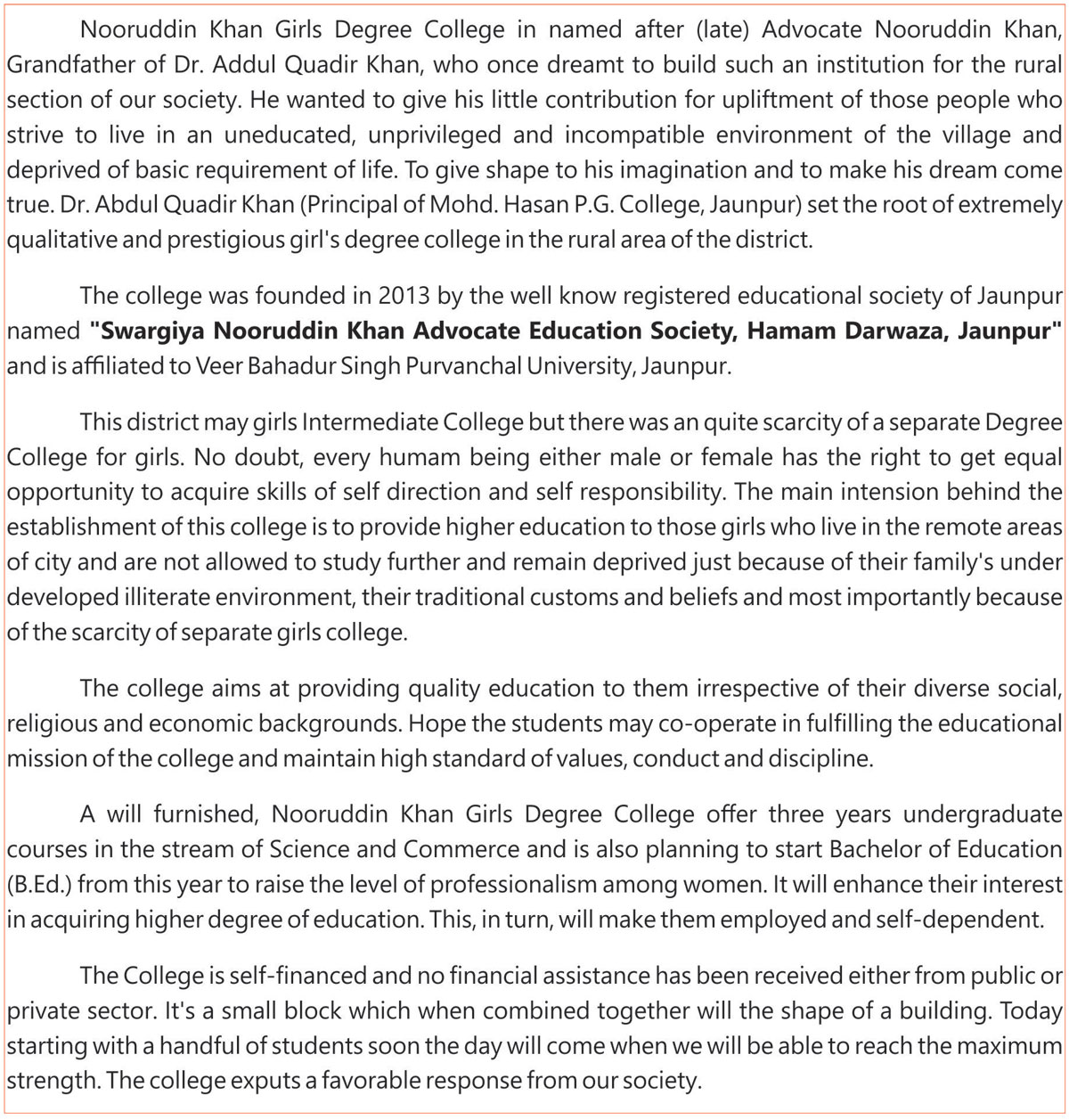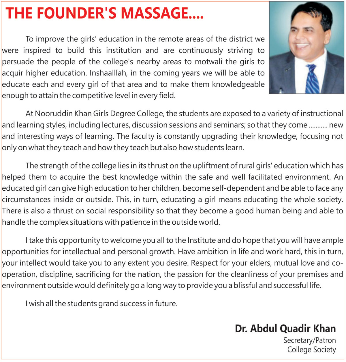 First of all I welcome all of you in the college. You will be taught by the best teachers of the area. I assure you that I all of your needs will be taken care of to get best out of college. Our College has a good library as well as vast play grounds. The college conducts extracurricular and cultural activities to make all around development of its students. I am delighted that you have chosen our college which renders adequate guidance and assistance in understanding the creativity, scientific and managerial skills of bachelor level graduates.